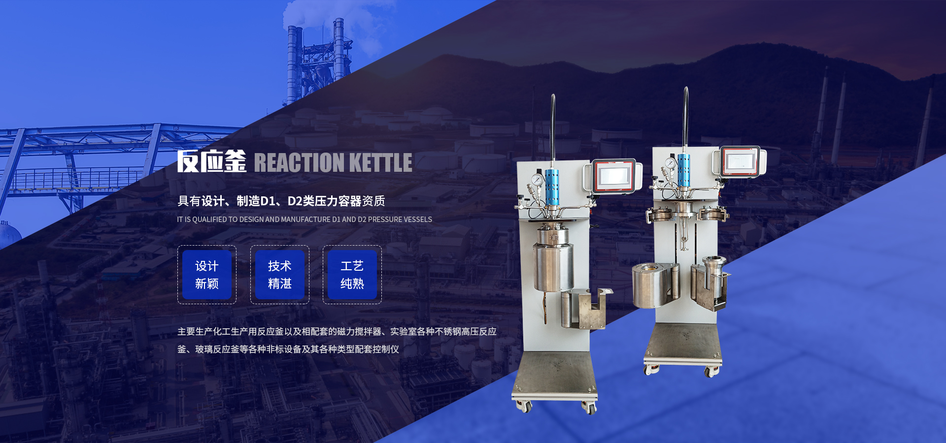 主要生产化工生产用反应釜及配套磁力搅拌器、实验室用:高压反应釜、不锈钢反应釜、玻璃反应釜、实验室反应釜、水热反应釜、均相反应器、连续反应装置、瓶聚槽反应装置等各种非标设备及各种类型配套控制仪。